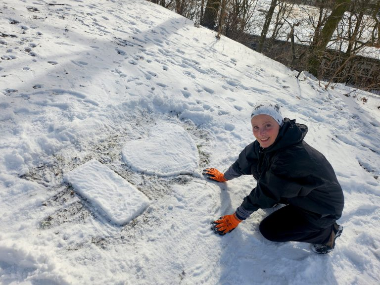 Als Thema wähle ich kurzerhand „I love Hamburg“. Los geht’s. Den Boden etwas ebnen, in Ermangelung einer Schablone das Motiv freihand in den Schnee skizzieren und dann das Umfeld vorsichtig ausheben. Dabei heißt es den pulverigen Schnee an den Kanten immer schön festzudrücken, damit nichts abrutscht. Schnell nimmt das Motiv Gestalt an.